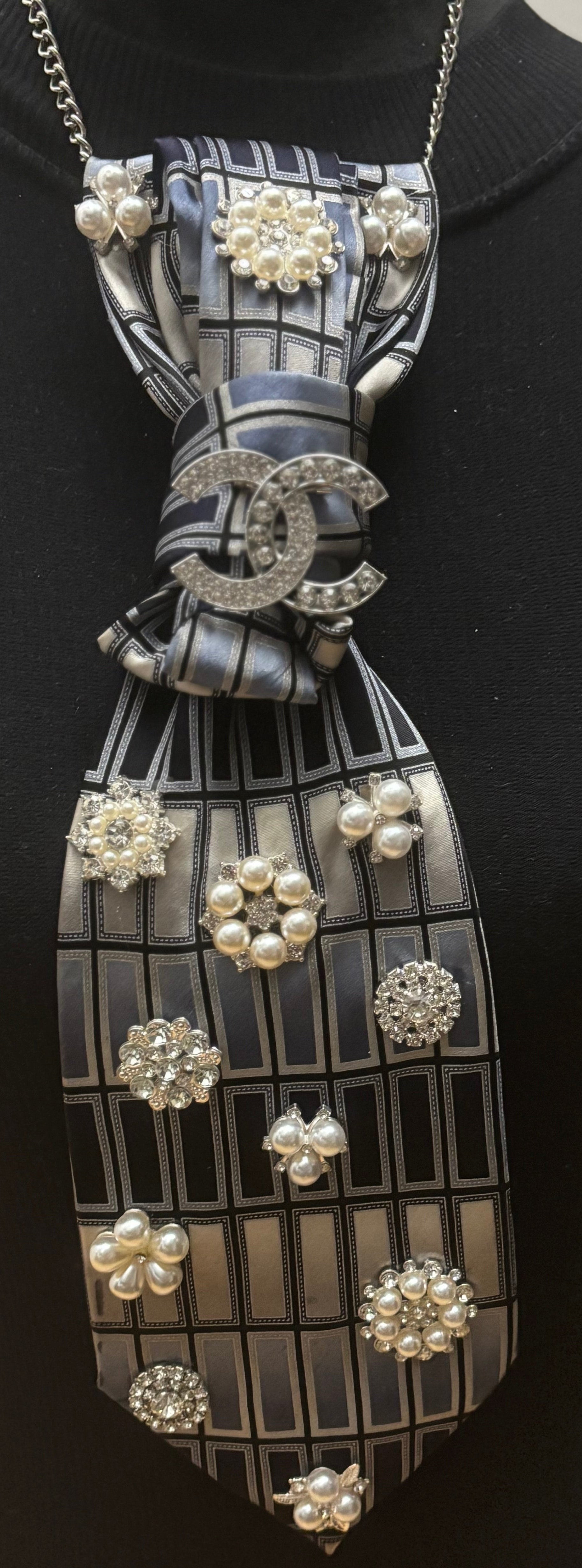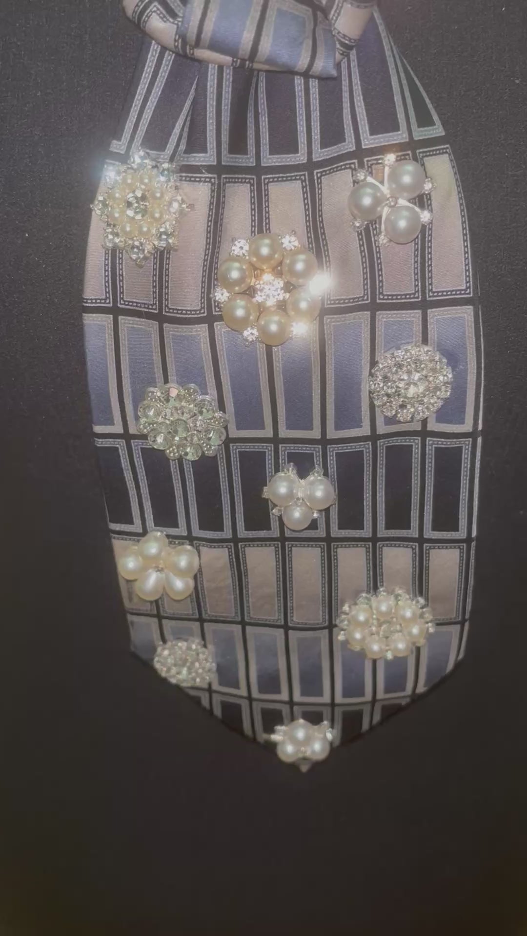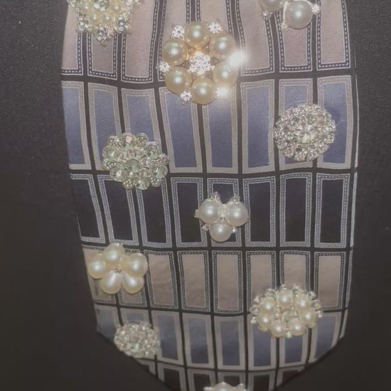 Modern. Daring. Divine. The Luxe Grid features a sleek black-and-silver geometric print layered with radiant pearl clusters and diamond-style crystals. Its structured design adds an avant-garde edge to any outfit, while the balanced placement of each embellishment creates a harmonious shimmer. A must-have for those who dare to mix art and fashion.