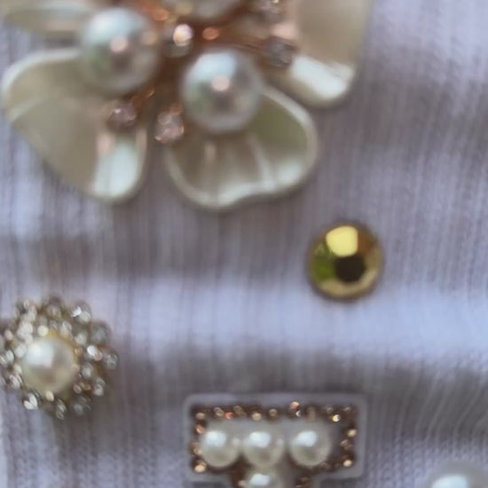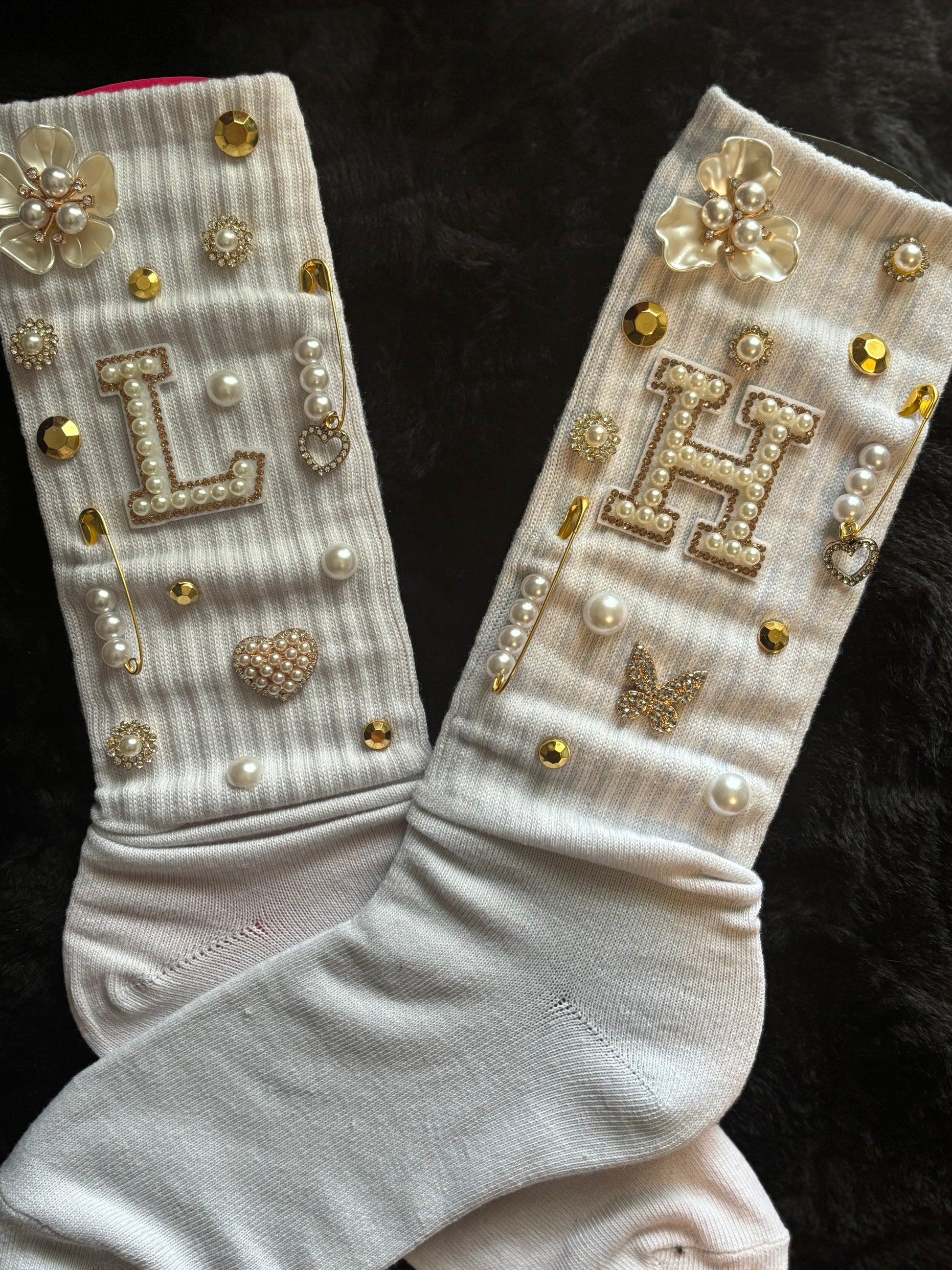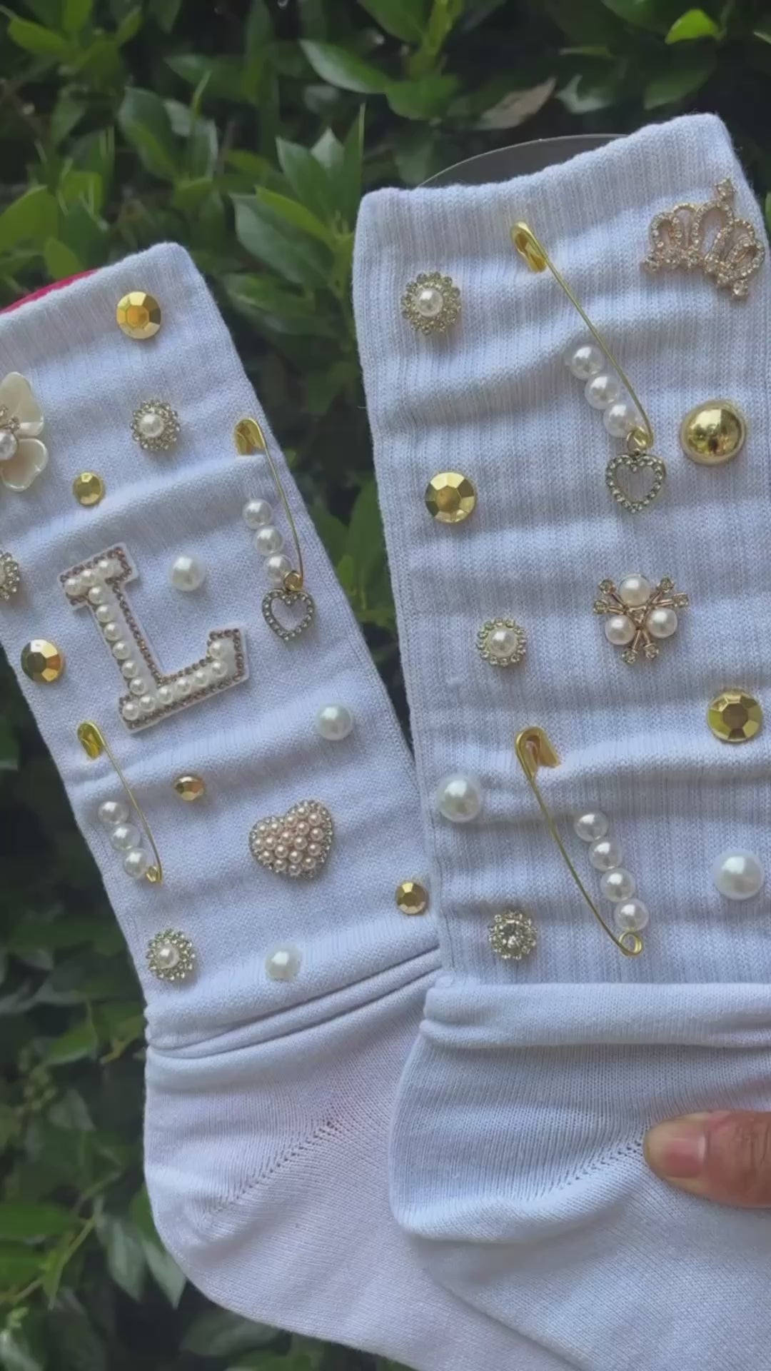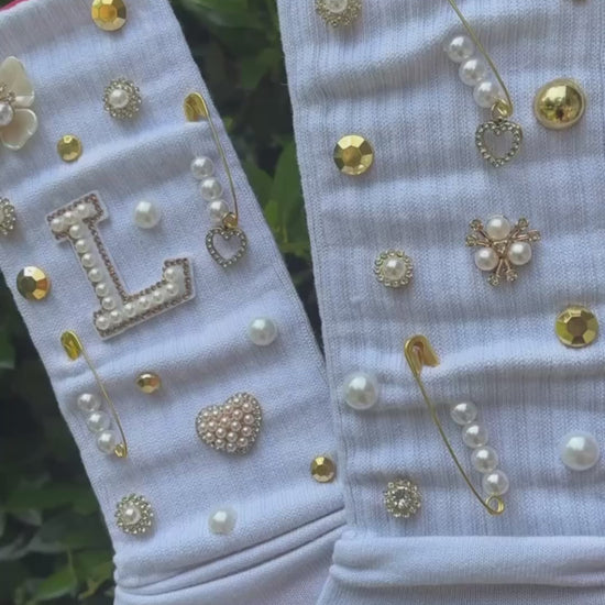 Turn heads this school year with our bestselling Adollaree Kick Flair Junk Socks – now available as a special Back-to-School Edition! These one-of-a-kind, handcrafted socks are decked out in pearls, rhinestones, and glam charms for the ultimate accessory upgrade. Each pair features your choice of two custom letters to make it uniquely yours or perfectly personalized for a gift.
