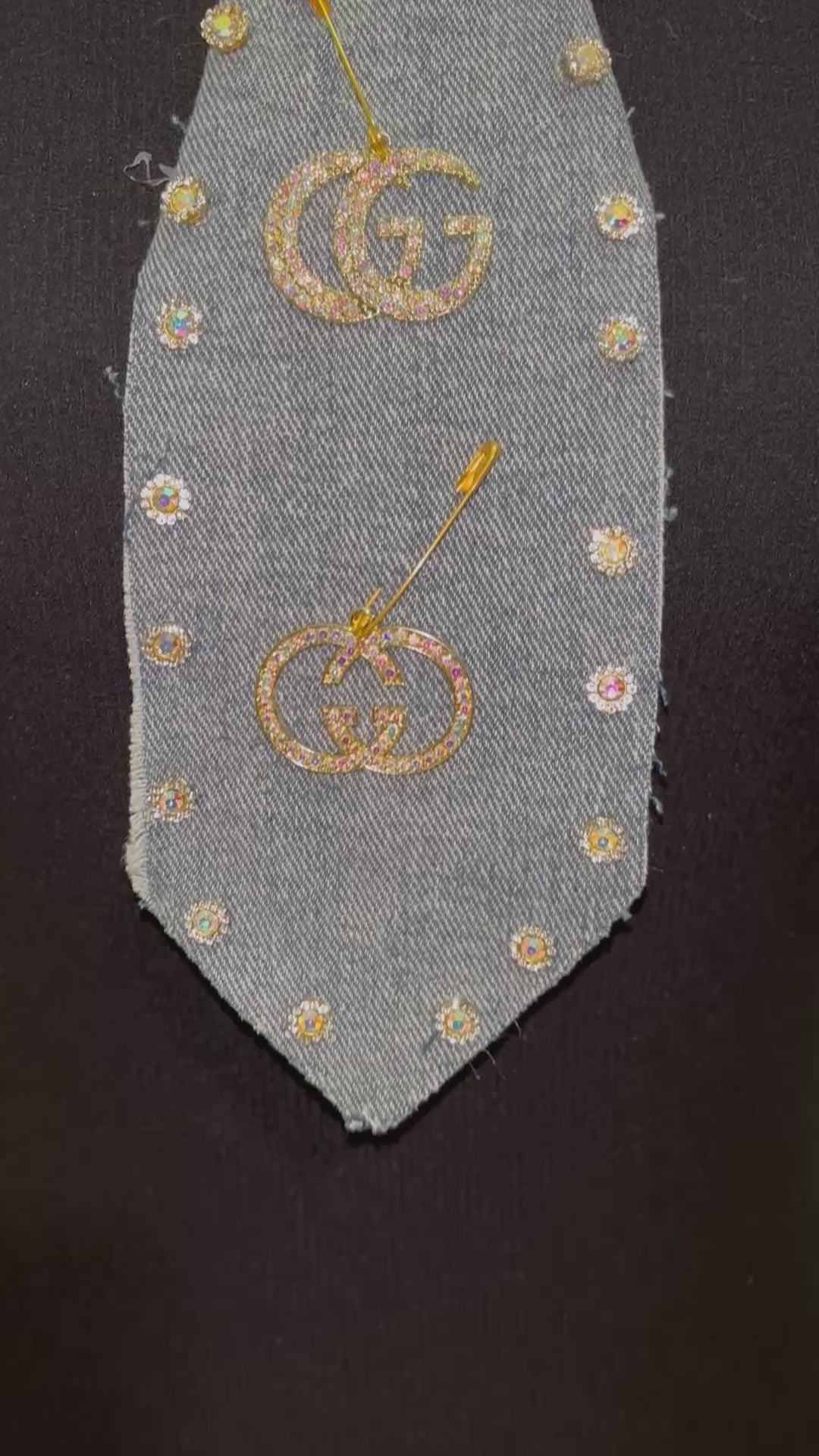 The Golden Emblem Glam Denim Necktie is a radiant statement piece that captures confidence, creativity, and couture-level shine. Handcrafted from repurposed denim, this one-of-a-kind accessory is adorned with glimmering crystal accents and golden embellishments that elevate casual fabric into wearable luxury.