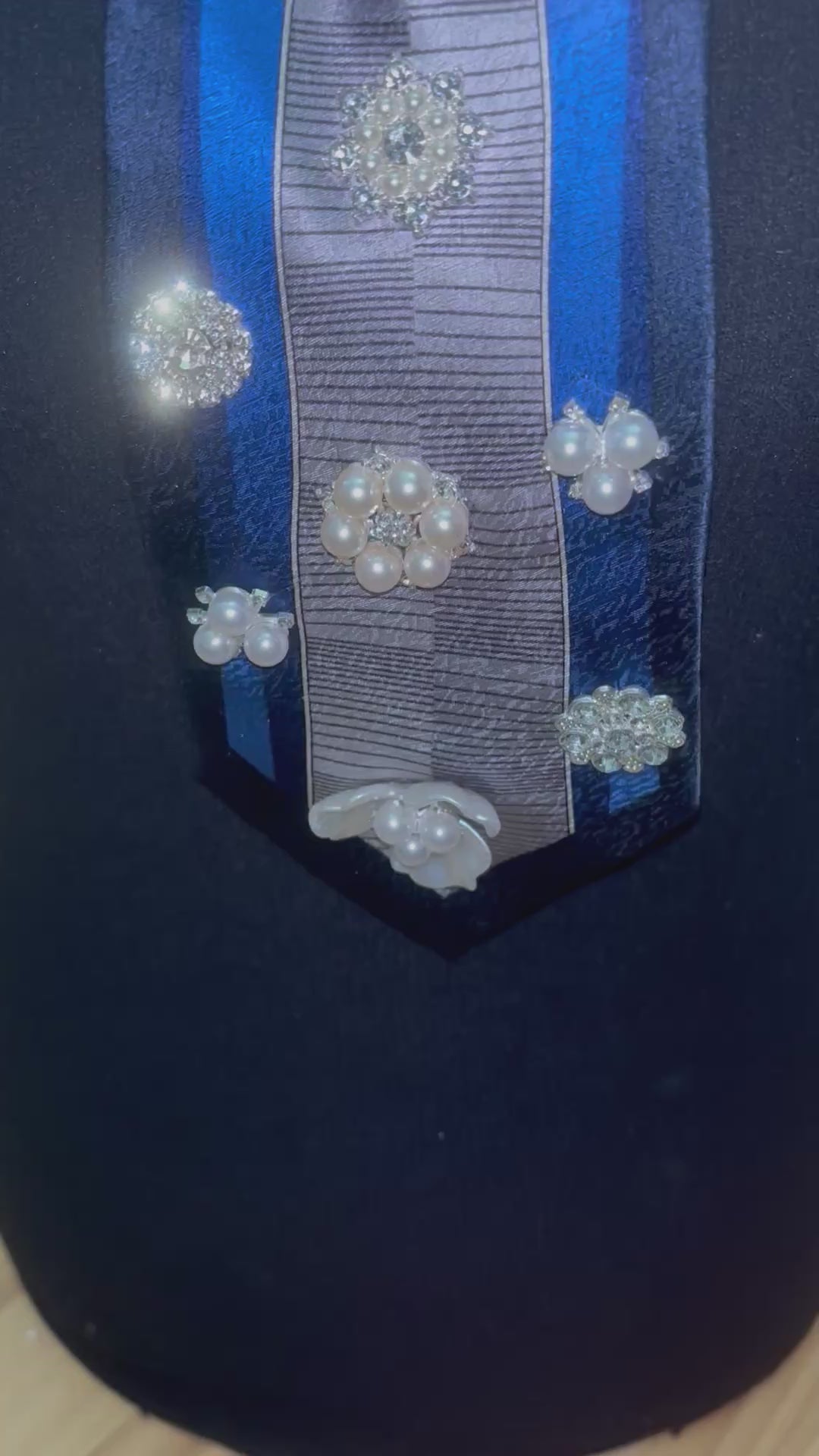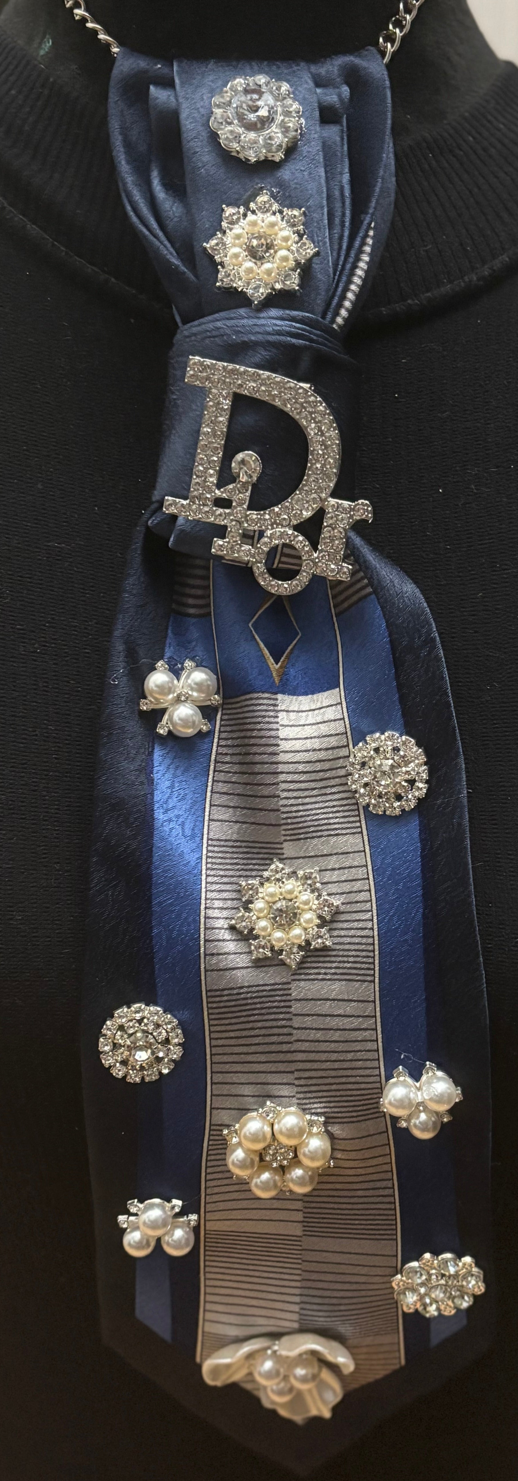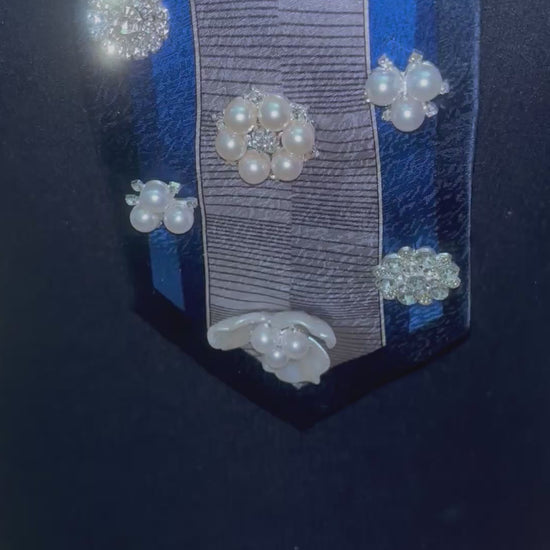 The Midnight Royal is where sophistication meets sparkle. Deep navy and silver tones create a regal base, layered with intricate brooch-style pearls and crystal clusters. The combination of rich satin and striped silver accents evokes a royal-court elegance, while each gem and rhinestone catches light for a breathtaking finish. It’s a tie that tells the world you’re unforgettable.