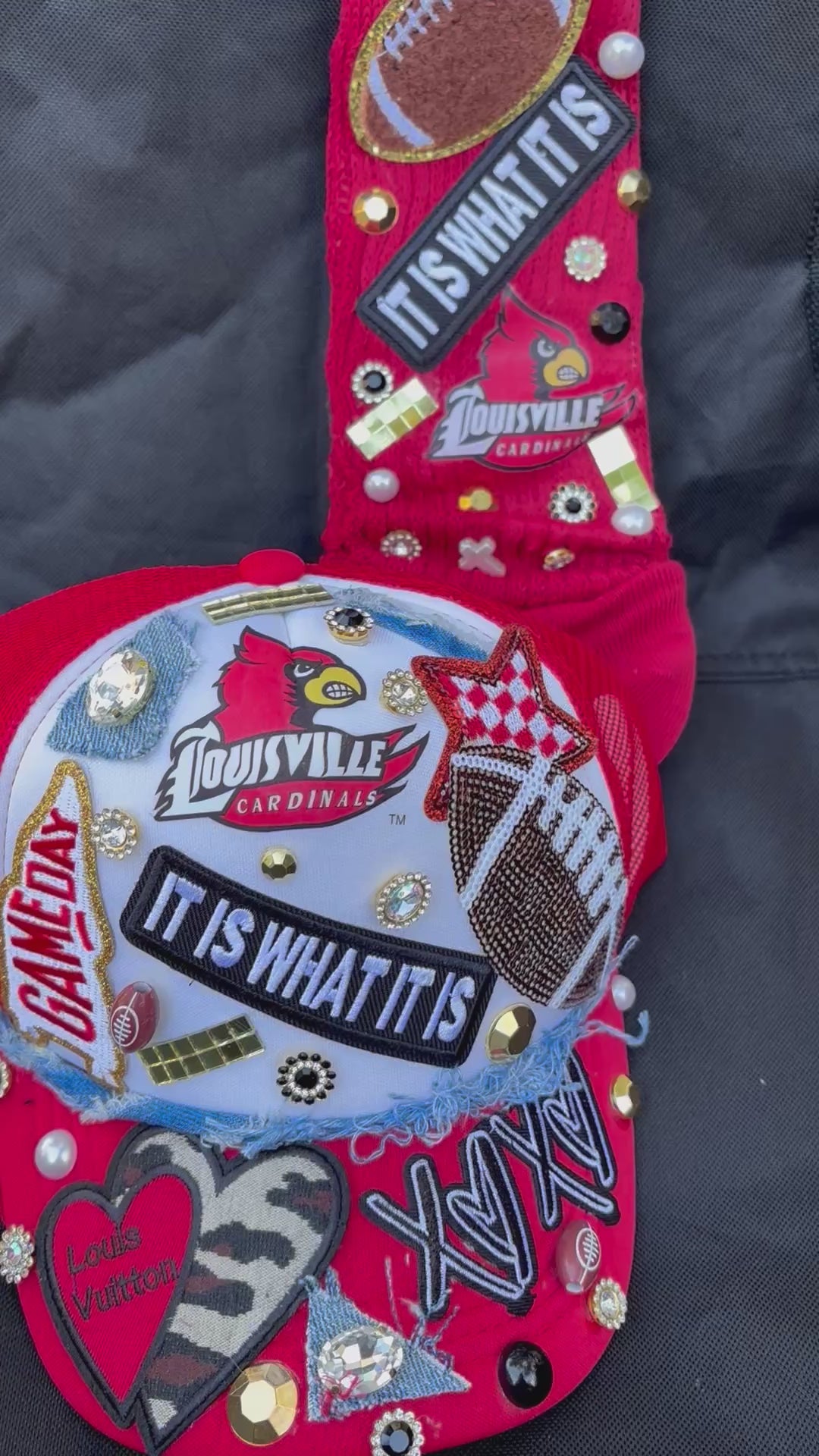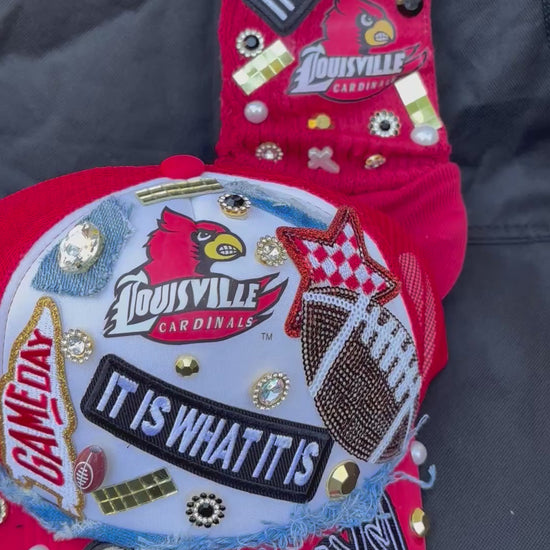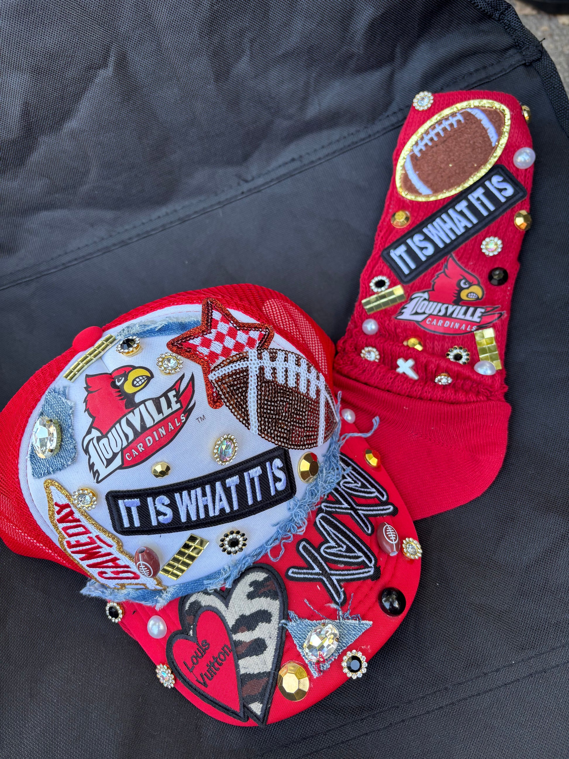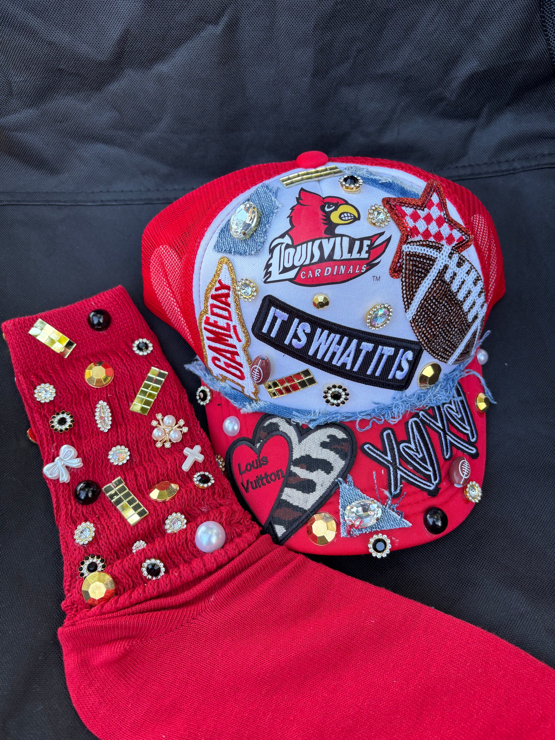 The Cardinal Queen Glam Set celebrates bold energy and fearless flair. This eye-catching red set combines sporty spirit with feminine luxury. The custom hat and socks feature dazzling rhinestones, pearls, and metallic details paired with mixed-texture appliqués that bring sparkle and attitude together.
