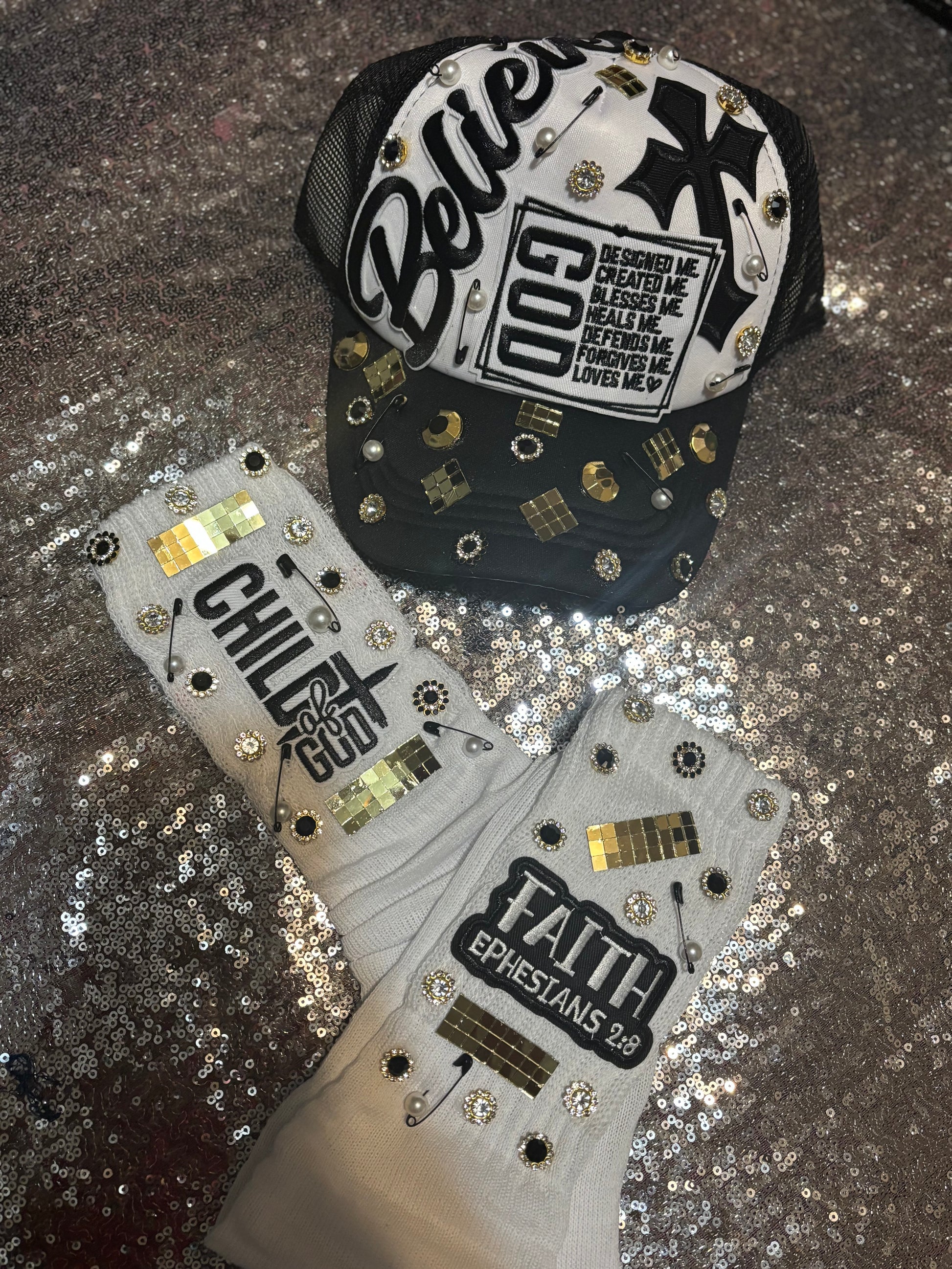 The matching socks complete the look with inspiring patches that read “Child of God” and “Faith – Ephesians 2:8.” Each pair is custom-decorated with shimmering gold details, pearl accents, and stylish safety pins for a signature Adollaree touch that blends devotion and design.