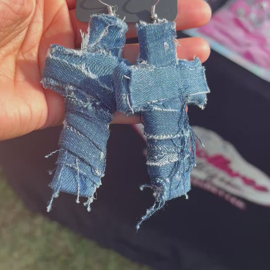 Show your faith and your flair with the Crossed in Denim Earrings, a handcrafted pair from Adollaree Boutique’s Tied in Denim Collection. Each cross is carefully shaped from repurposed blue jean fabric, layered with distressed frayed texture for a bold, rustic, and fashion-forward finish.