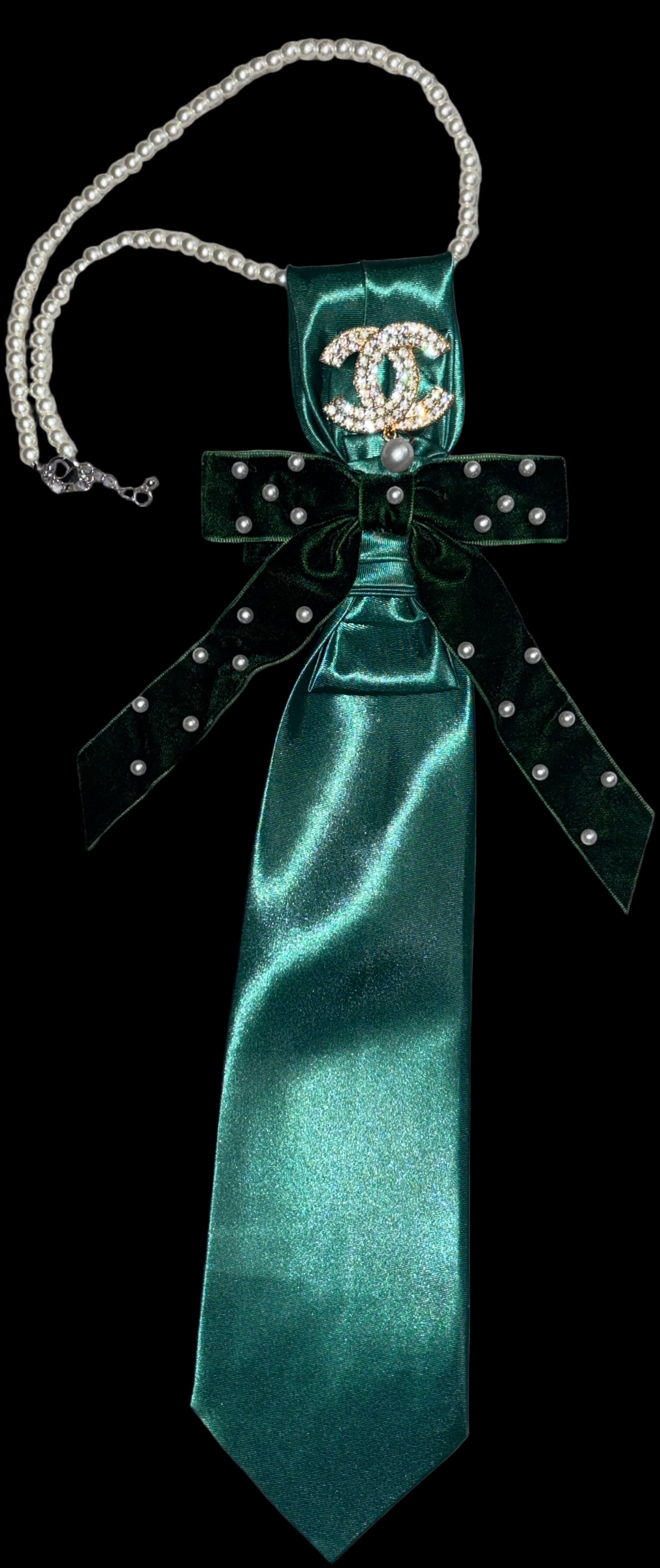 Serve elegance with a bold, glam finish in our Emerald Pearl Ribbon Luxe Statement Tie—a handcrafted accessory made to stand out. This piece features a rich emerald satin-finish tie with a smooth, glossy sheen, paired with a dramatic deep-green velvet ribbon bow detailed with pearl accents for a luxe, elevated touch.