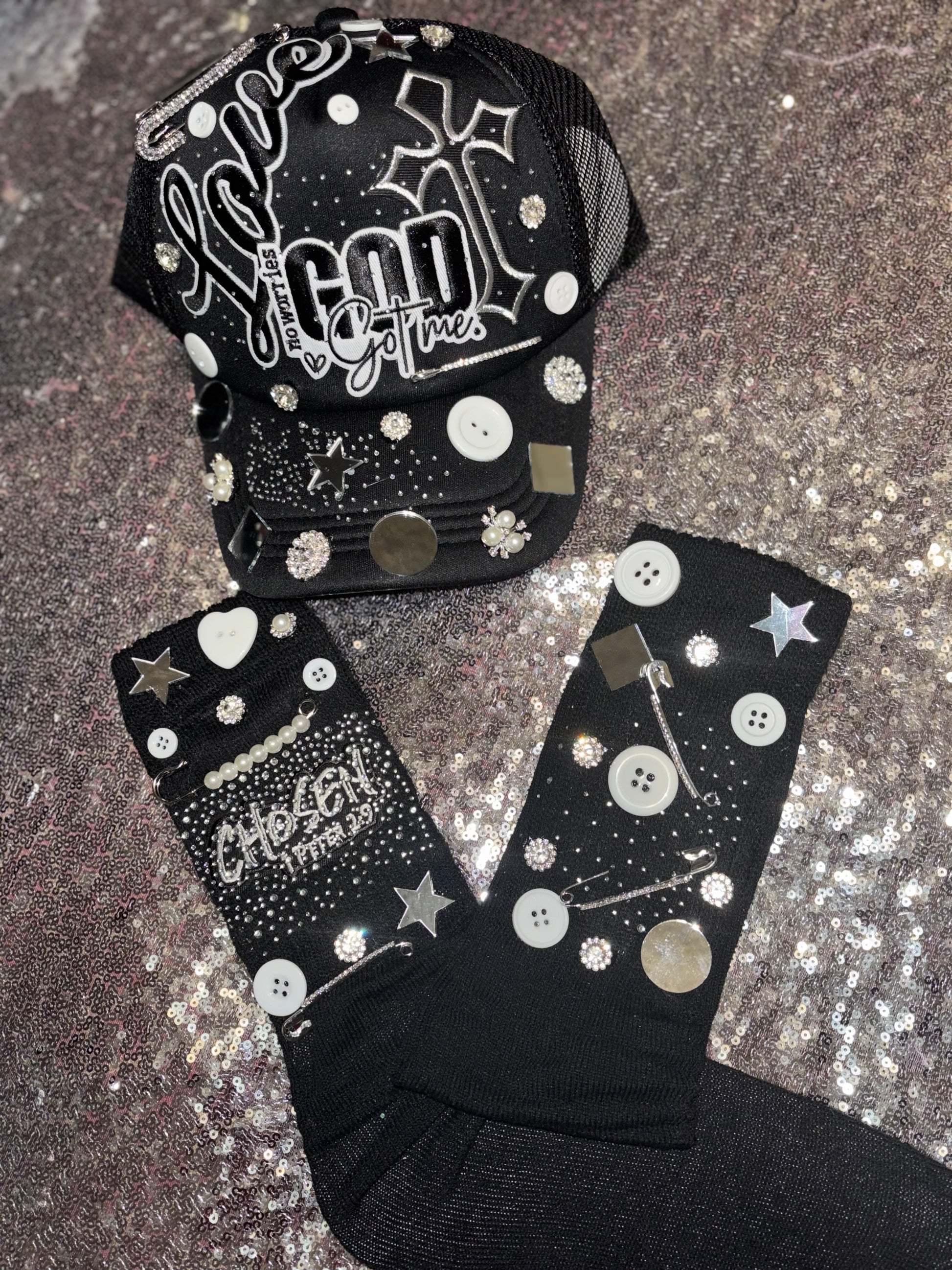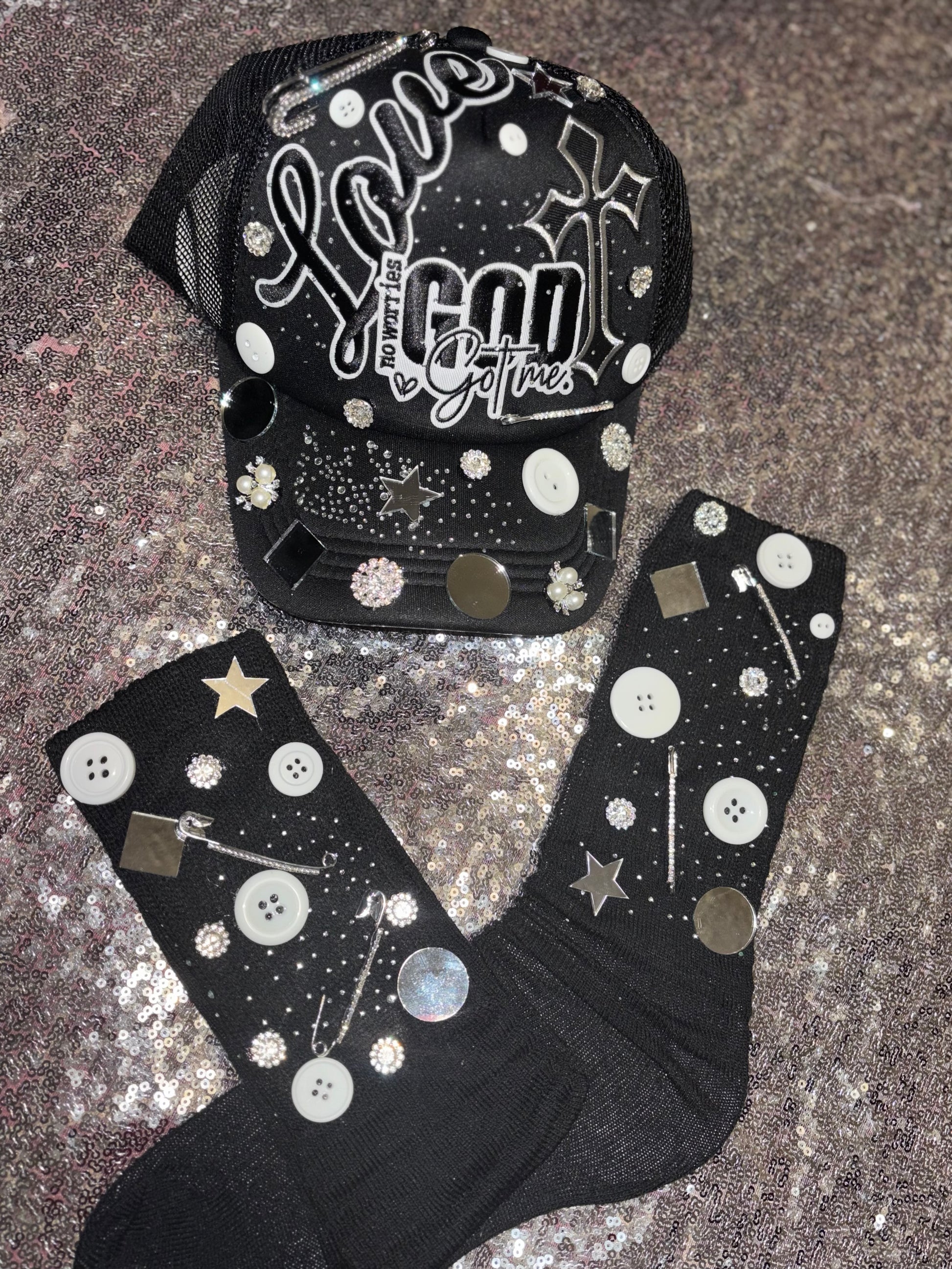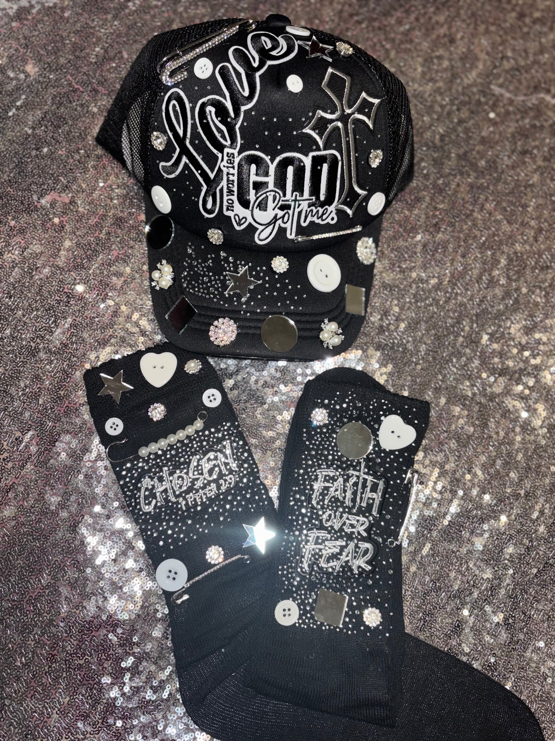 Stand bold in faith and shine in style with the God Got Me Bling Set, part of Adollaree Boutique’s empowering Shield of Faith Collection. This striking handcrafted duo features a blinged-out trucker hat and matching slouch socks that beautifully blend fashion, faith, and fearless energy.
