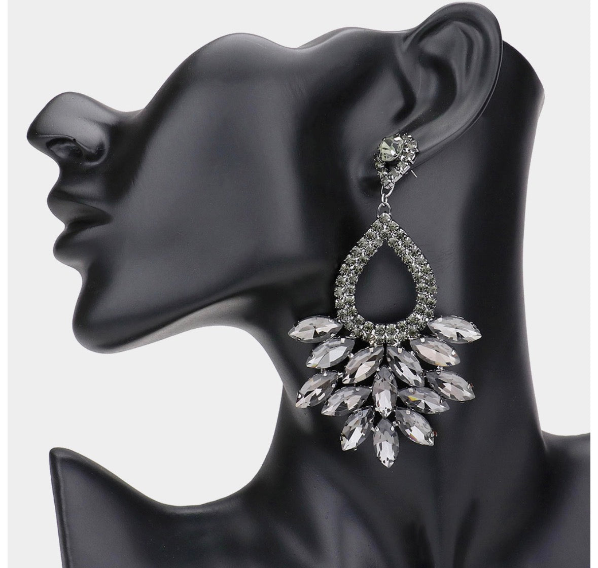 These dramatic chandelier earrings feature a crystal-encrusted teardrop frame that cascades into a radiant cluster of faceted marquise-cut stones, creating breathtaking movement and shimmer with every turn of your head. The smoky crystal tones deliver a sophisticated midnight glow that pairs beautifully with both evening glam and elevated everyday style.