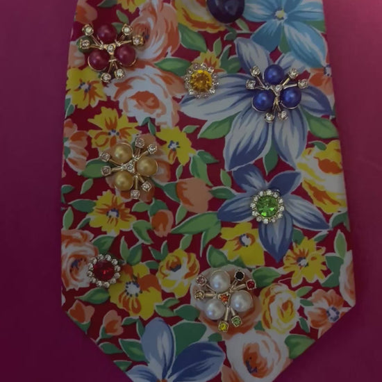 Designed on a lively floral canvas bursting with rich reds, oranges, blues, and greens, this piece captures the essence of joy, femininity, and fearless expression. Every inch of this tie is elevated with multi-colored gemstone embellishments, creating a radiant, eye-catching sparkle from every angle.
