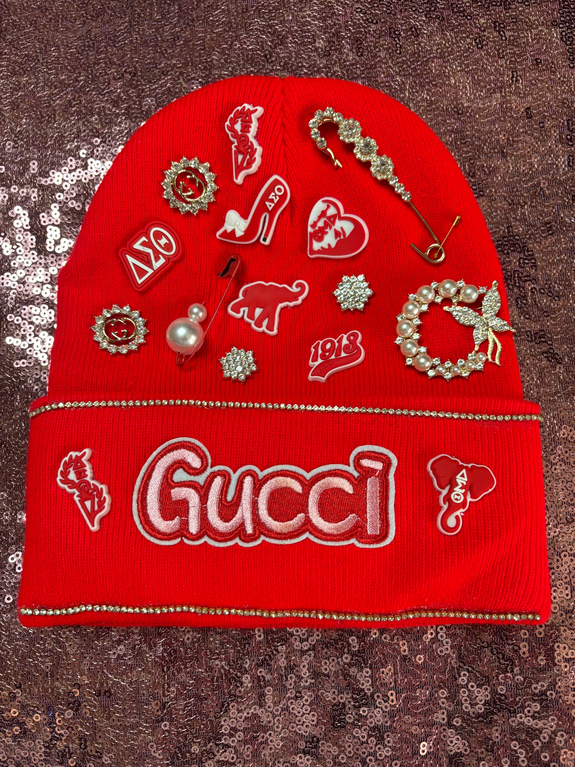 Show off your pride, personality, and style with this richly embellished red couture beanie. This standout winter accessory blends sisterhood-inspired elements with high-fashion details, making it perfect for members, supporters, and anyone who loves bold glam.